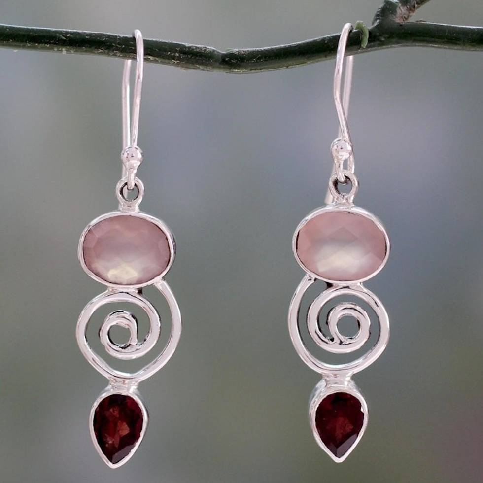 Silver Dangle Earrings with Rose Quartz and Garnet Stones 'Romantic Journey' Item ID: 2669924718