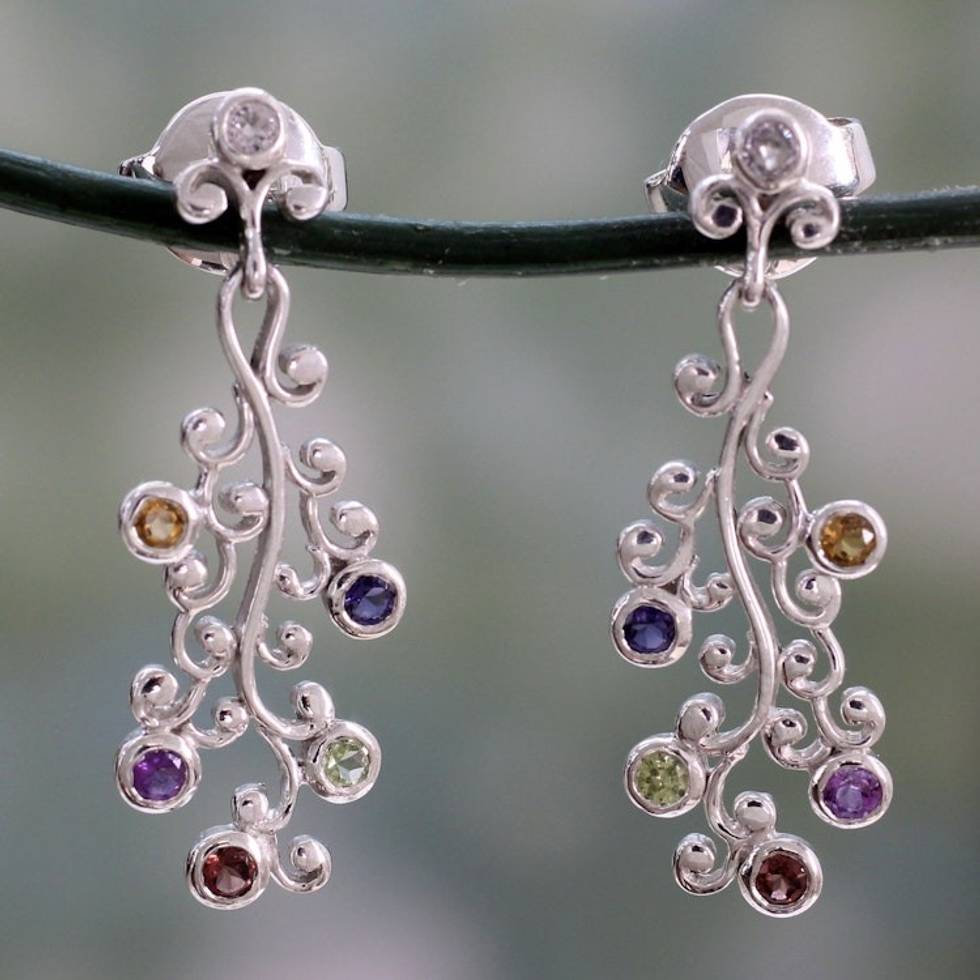 Silver Earrings Handcrafted with 6 Kinds of Gems 'Rainbow Wisteria' Item ID: 2671619115