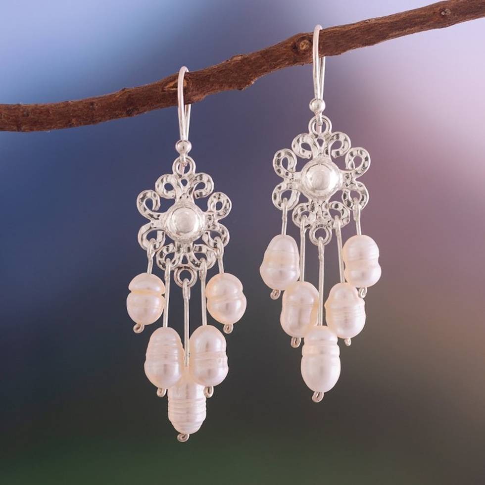 Silver Floral Chandelier Earrings with Cultured Pearls 'Lustrous Flowers' Item ID: 2671400832
