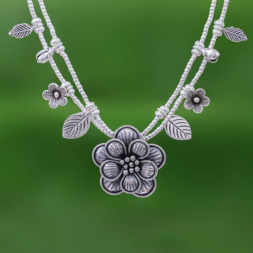 'Basket of Posies', necklace is unique and pretty. Too long for me, one knot solved problem. Eye Catching. Wear with 'Urban Love' earrings and 'Weaving Fantasies' ring, both by designer, Achara. Can also wear with large, 'Chiang Mai Rose' earrings by Achara. Price higher than other necklaces by Pakaon Sojintarit...may be because silver is 950. Solid, well made. Happy with purchase.