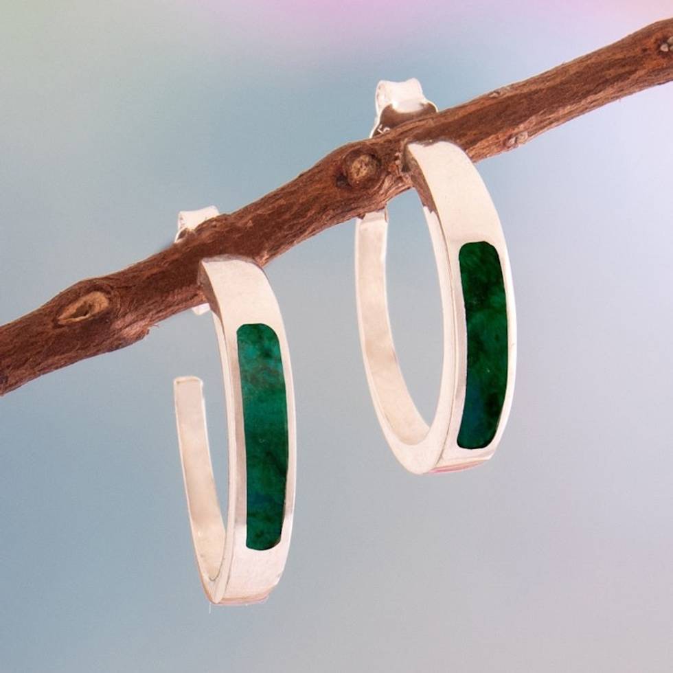 Silver Half-Hoop Earrings with Inlaid Chrysocolla Gemstone 'Dual Enchantment' Item ID: 2671697825