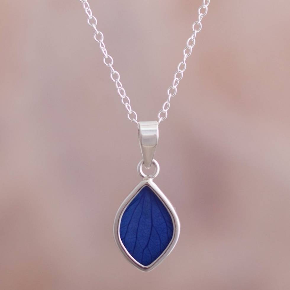 Silver Necklace with Natural Leaf Pendant 'Nature's Gem in Blue' Item ID: 2669919350