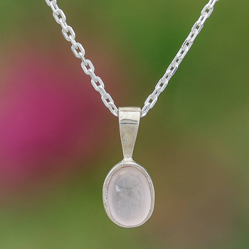 "A mesmerizing rose quartz stone steals all the glances in this sterling silver pendant necklace, catching flashes of light with every turn. Its soft glow and shifting colors bring a touch of mystery to any outfit. Designed by Thai artisan Chatchanop Naratcharuj, this chic accessory blends minimalism with a hint of enchantment."
