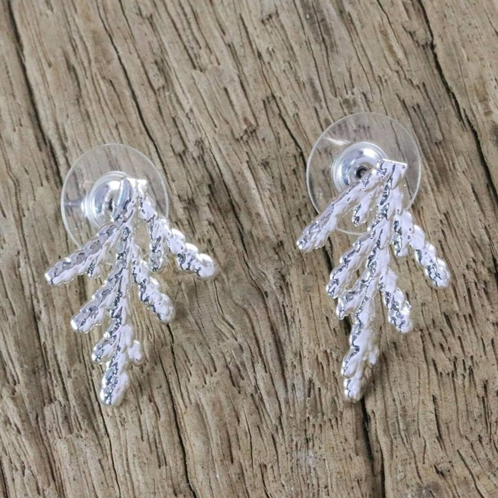 Silver Plated Natural Cypress Leaf Earrings from Thailand 'Natural Needles' Item ID: 2672186817