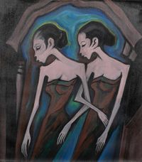 "Two almost identical female figures stand united in this bold contemporary painting, their synchronized poses creating a mesmerizing dance of symmetry and strength. The acrylic masterpiece bursts with carefully chosen hues-deep blacks anchor the composition while soft beiges, ocean blues and earthy browns breathe life into these connected souls. Each brushstroke by Javanese artist Hendarto reveals his masterful ability to distill human bonds into pure visual poetry, transforming the canvas into a celebration of sisterhood and also feminine solidarity that speaks directly to the heart."