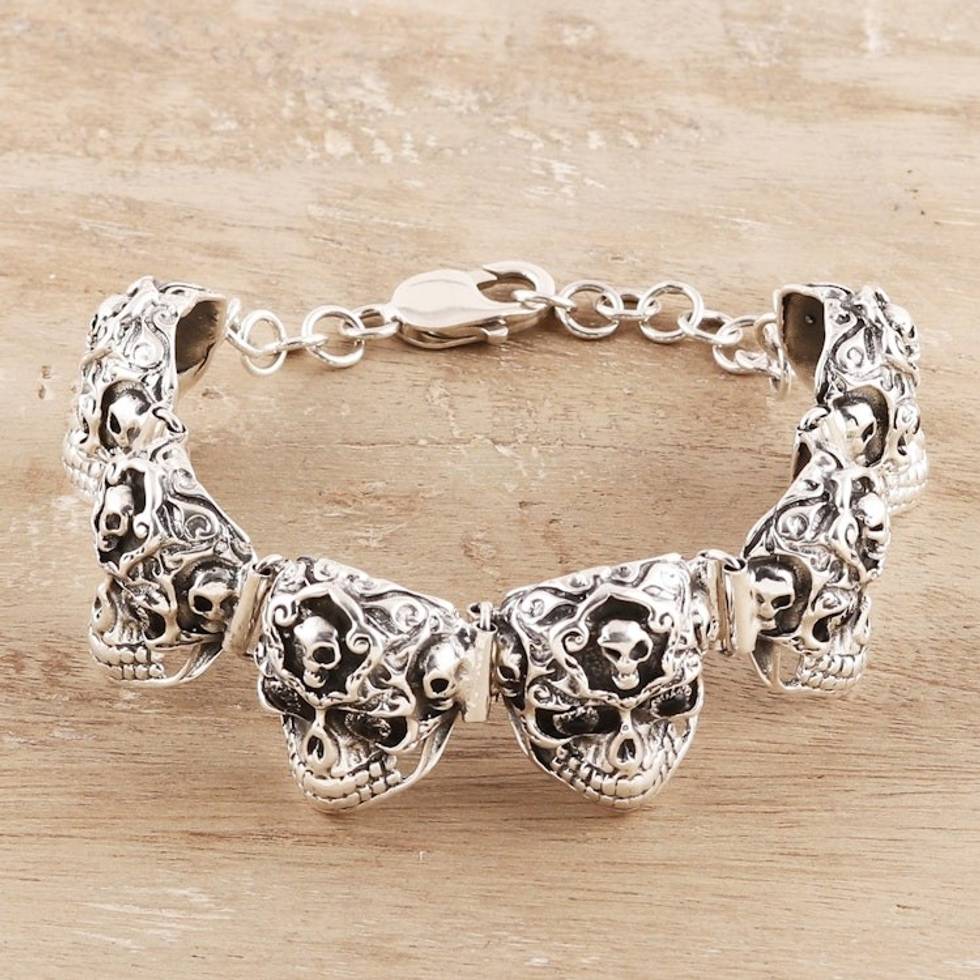 Skull-Pattern Men's Onyx Link Bracelet from India 'Macabre Skulls' Item ID: 2671792188