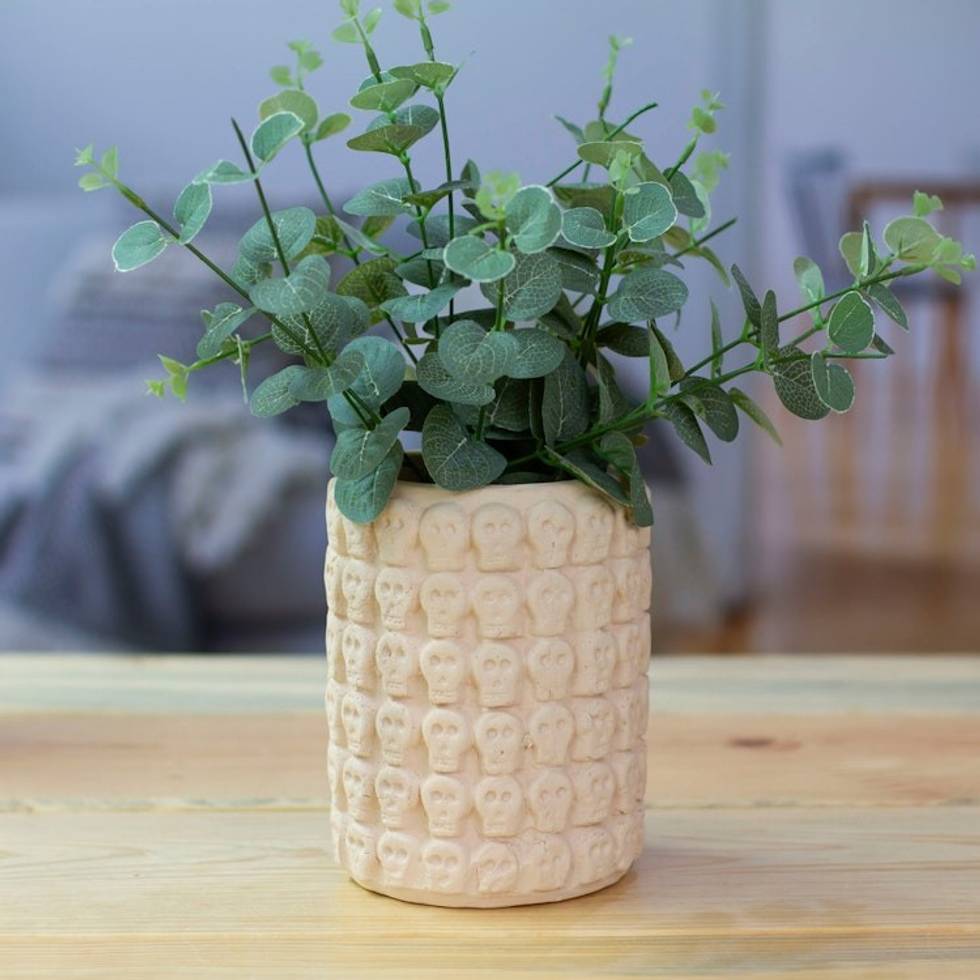 "In Mesoamerican belief, the skull is a powerful symbol, not only of death as we know it but also of the afterlife. This white ceramic flowerpot by Aldo Alvarez is an interpretation of the Aztec tzompantli, a rack where the heads of sacrificial victims were displayed as an offering to the gods. Carrying great cultural richness, the piece has a hole that allows for drainage."