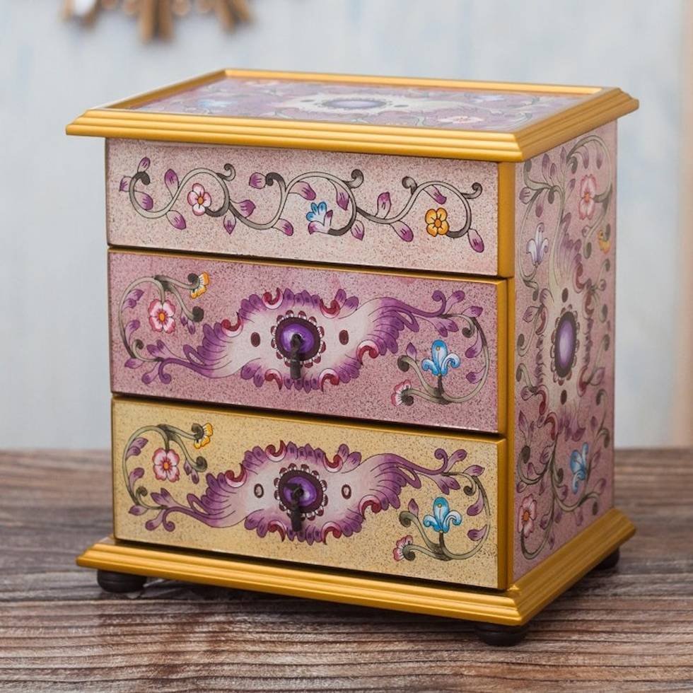 I received my new jewelry box and it's so beautiful. It's very well made and the colors are so vibrant. My only (small) complaint is the black paint inside the drawers. I think it would be better if the wood were stained a lighter color inside. Somehow the black color makes things harder to find. But otherwise this is a stunning piece and holds all my pins and bracelets.