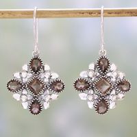 "Petite flowers of sterling silver surround five carats of smoky quartz in petal shapes, hanging from hooks. Presented by Mahavir, this pair of beautiful Indian dangle earrings features a handcrafted design by local artisans."