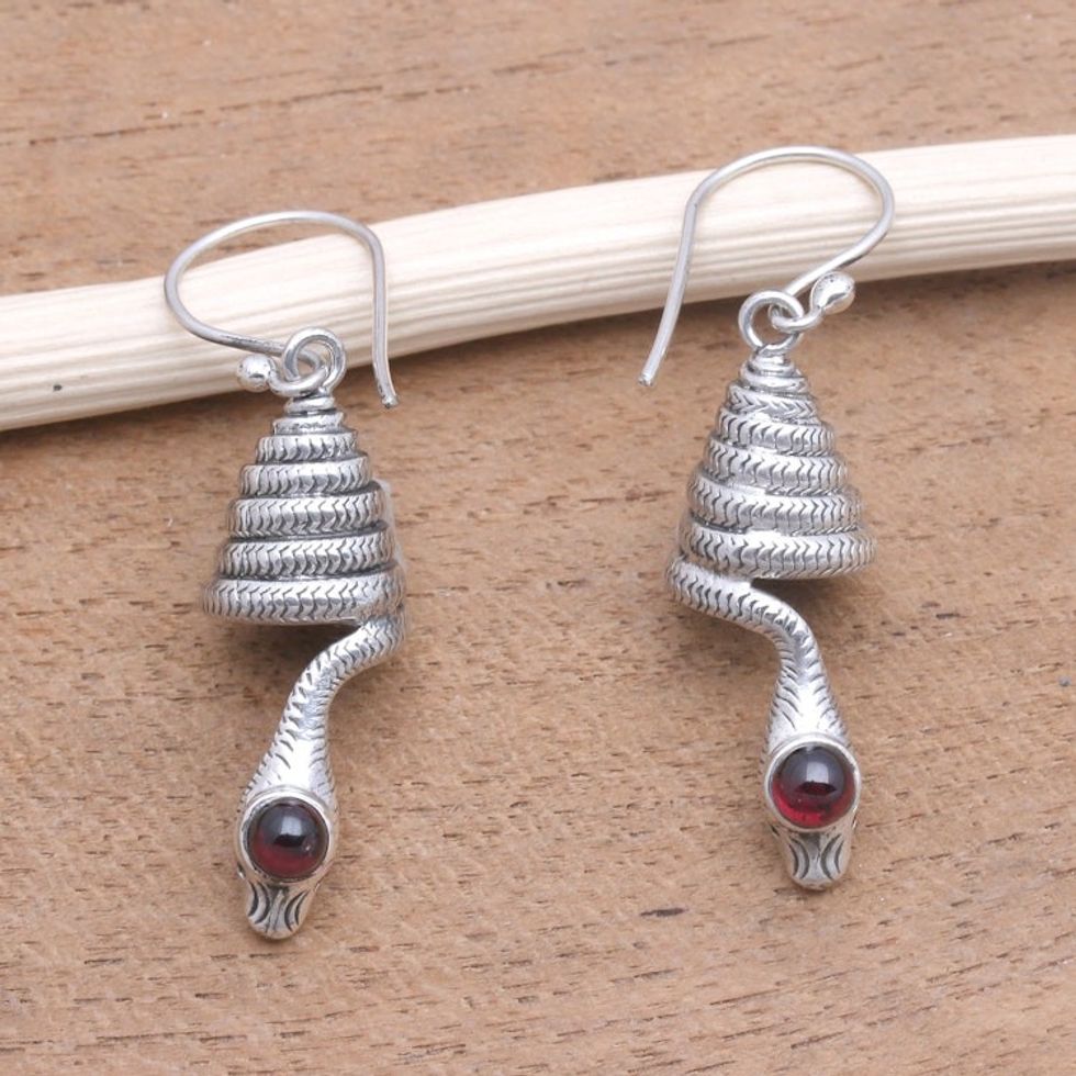 Snake-Shaped Garnet Dangle Earrings from Bali 'Coiled Snakes' Item ID: 2671737577