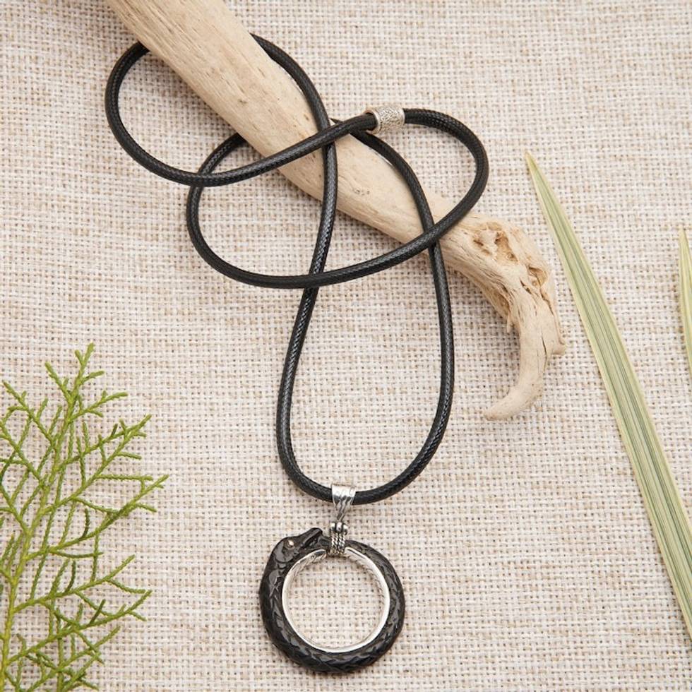 "Embodying immortality, intellect and healing, the snake's spirit blesses this majestic necklace crafted by Maria and Gennadii in Bali. Made on a round sterling silver structure, the accessory features a hand-carved depiction of this cunning creature, all made from a horn in a natural dark hue that adds a mysterious vibe to the piece."