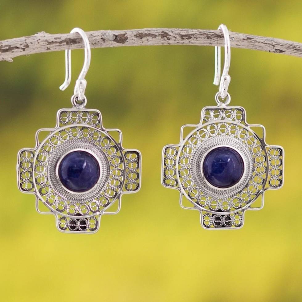 Sodalite Chakana Cross Filigree Dangle Earrings from Peru 'Blue Mountain Chakana' Item ID: 2671690379