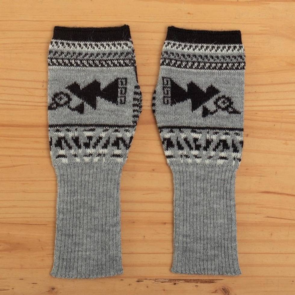 Soft Fingerless Mitts in 100 Baby Alpaca from Peru 'Chancay Icons in Grey' Item ID: 2671691142