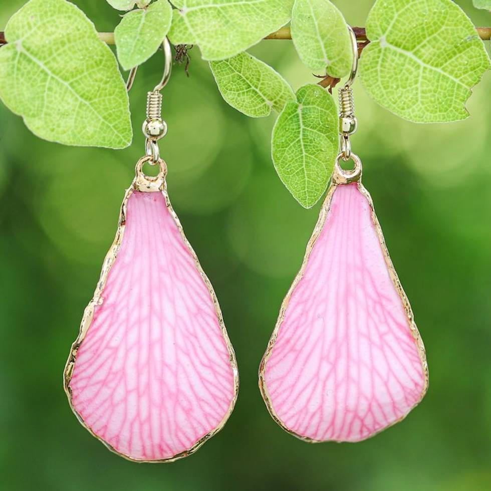 Soft-Pink Petal-Themed 22k Gold-Accented Dangle Earrings 'Dulcet Petal' Item ID: 2671646628