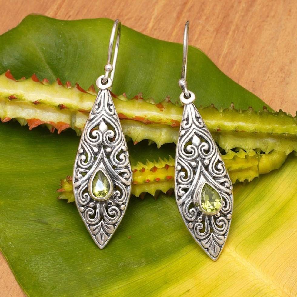 Spiral Motif Drop-Shaped Peridot Dangle Earrings from Bali 'Teardrop Spirals' Item ID: 2671732639