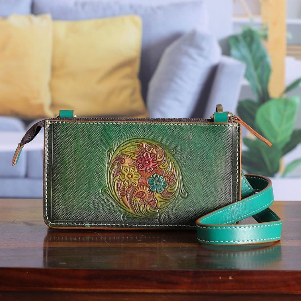"As if trapped in an eternal cycle, this leather sling seduces with evergreen spring flowers. Designer Vikram Uberoi of India captures Mother Nature's grace in this versatile accessory, whose detachable strap allows you to wear the piece as a clutch. Hues of dark ivy, viridian and green complete each embossed detail, while a handy zipper closure secures the suede-lined interior and its three card slots."