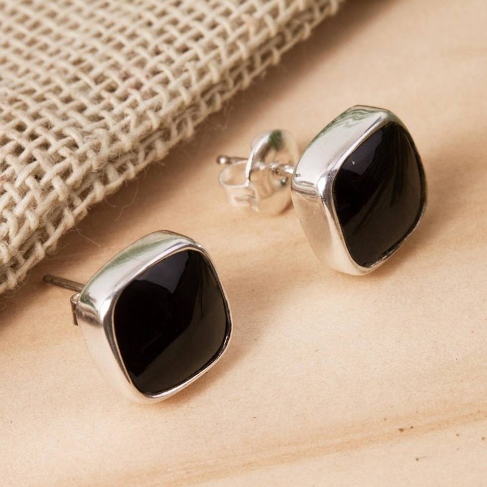 Square Obsidian Stud Earrings from Mexico 'Square Bucklers' Item ID: 2669927014