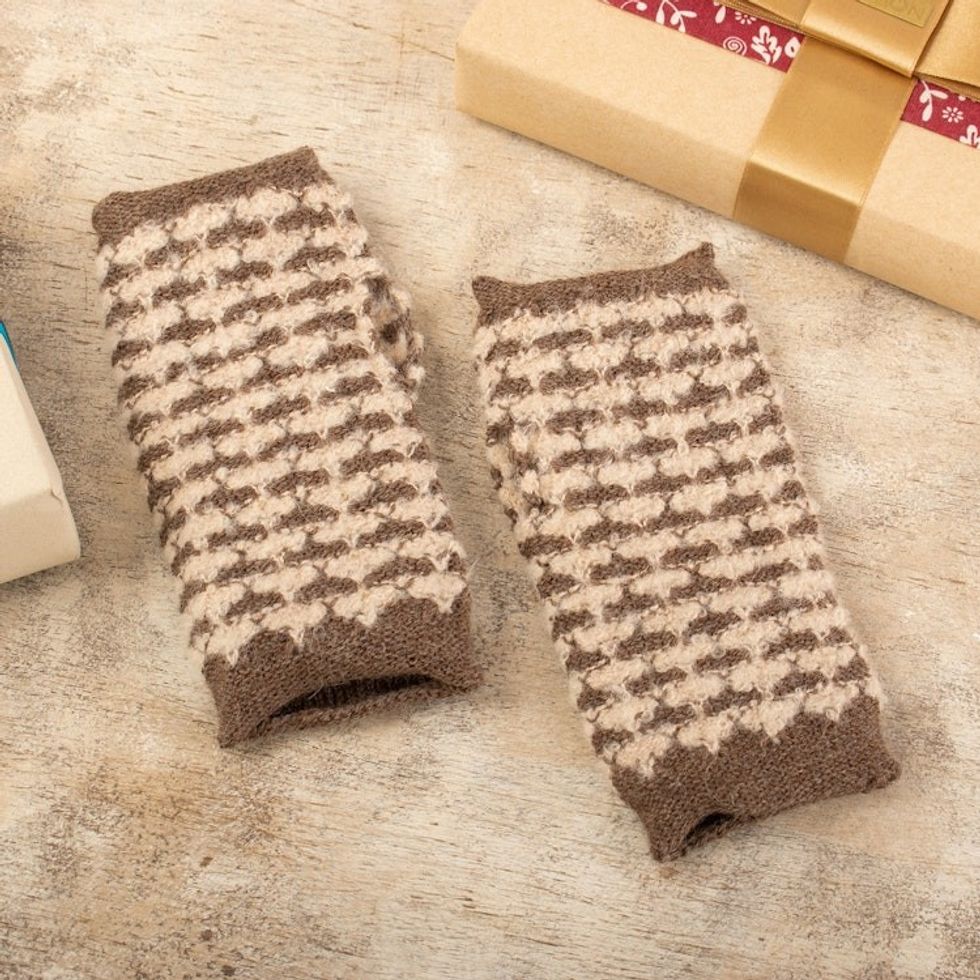 Square-Pattern Ivory and Taupe Alpaca Blend Fingerless Mitts 'Evening Squares' Item ID: 2671698104