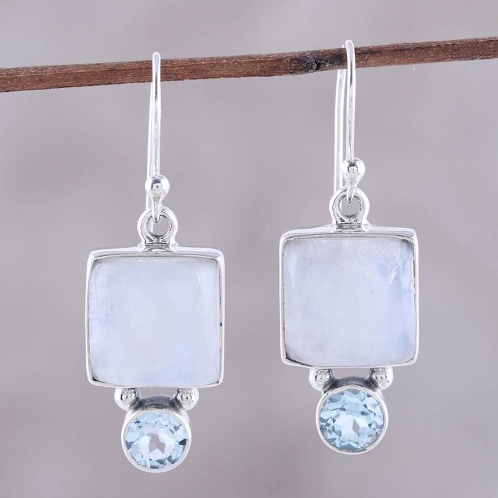 Square Rainbow Moonstone and Blue Topaz Earrings from India 'Creative Beauty' Item ID: 2671792331