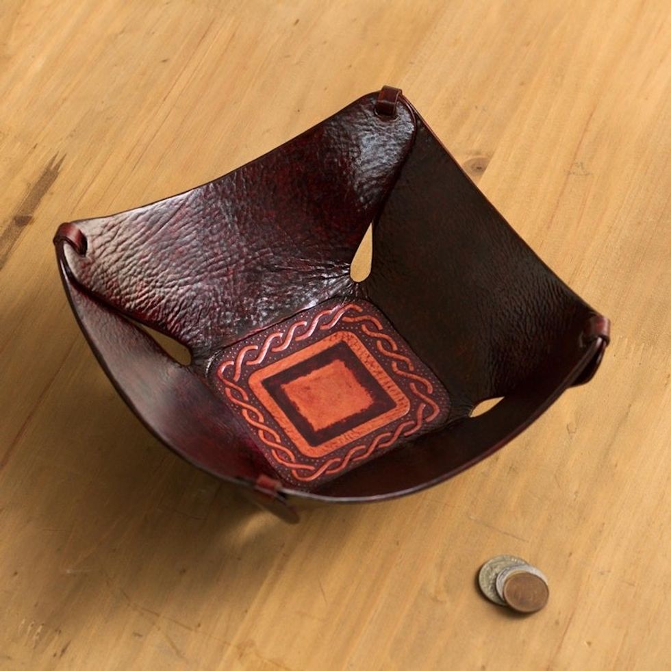 Beautiful leather hand tooled catchall. I use this every day, all day. My keyes go in it. My phone goes in it.
