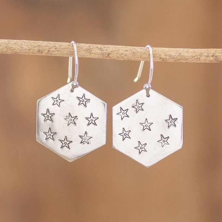 Star and Geometric Themed Sterling Silver Dangle Earrings 'Hexagon of Stars' Item ID: 2671771739