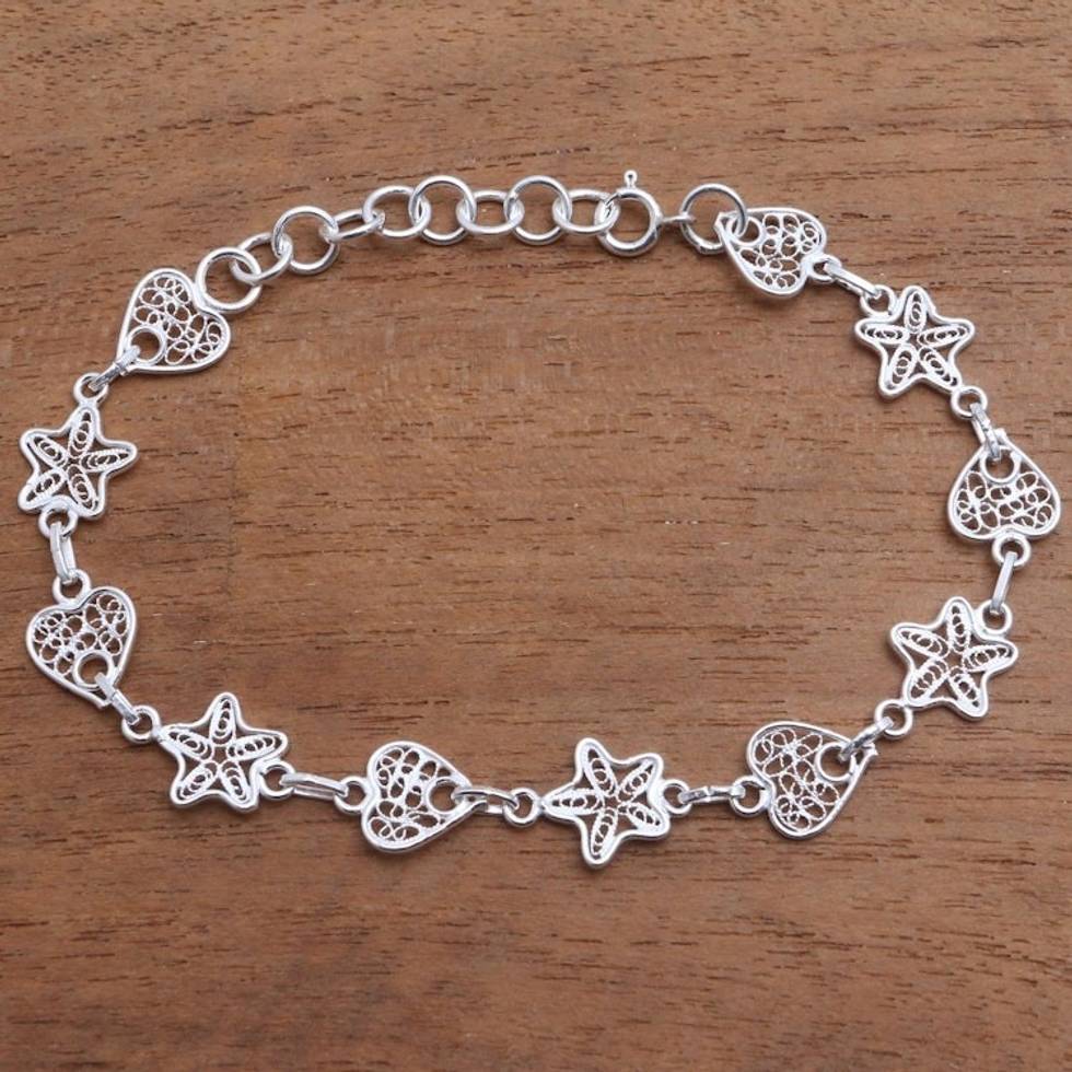 Star and Heart Sterling Silver Filigree Link Bracelet 'Hearts and Stars' Item ID: 2671736475