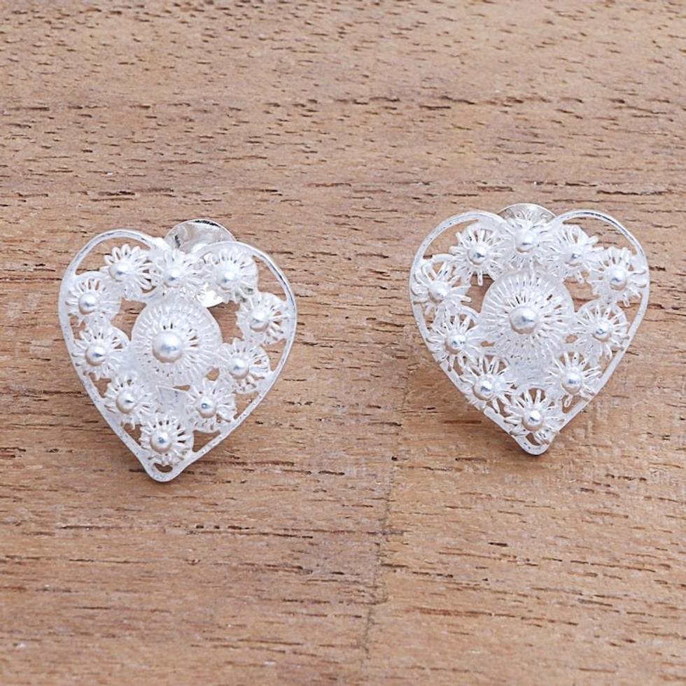 Star Pattern Sterling Silver Heart Earrings from Java 'Stars in the Heart' Item ID: 2671736585