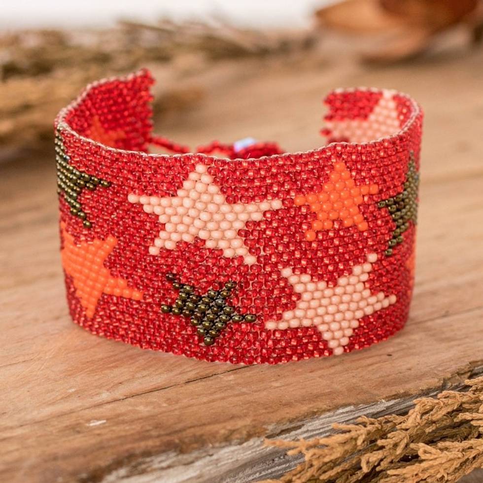 "Guatemala's Artisans of Panabaj capture the magic of a starry night in this wristband bracelet of shiny glass beads. Talented hands use nylon threads to weave each element into a bold design, whose red hue embraces a star pattern. A red crystal serves as a button clasp, allowing a fitted look."
