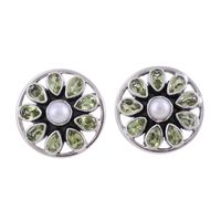 Star-Shaped Peridot and Pearl Button Earrings from India 'Glittering Stars' Item ID: 2671790976