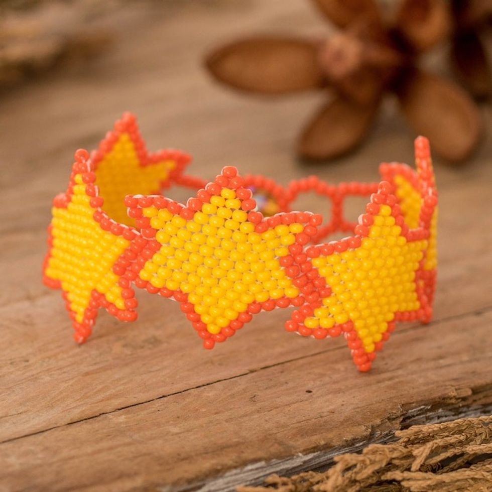"Dazzling and full of movement, this wristband bracelet forms radiant star motifs in electrifying yellow and orange shades. The intricate beadwork, crafted from petite glass beads, is topped with an adjustable crystal bead button closure that offers both comfort and versatility. Handmade by the Artisans of Panabaj in Guatemala, this colorful bracelet adds a vibrant touch to any look."