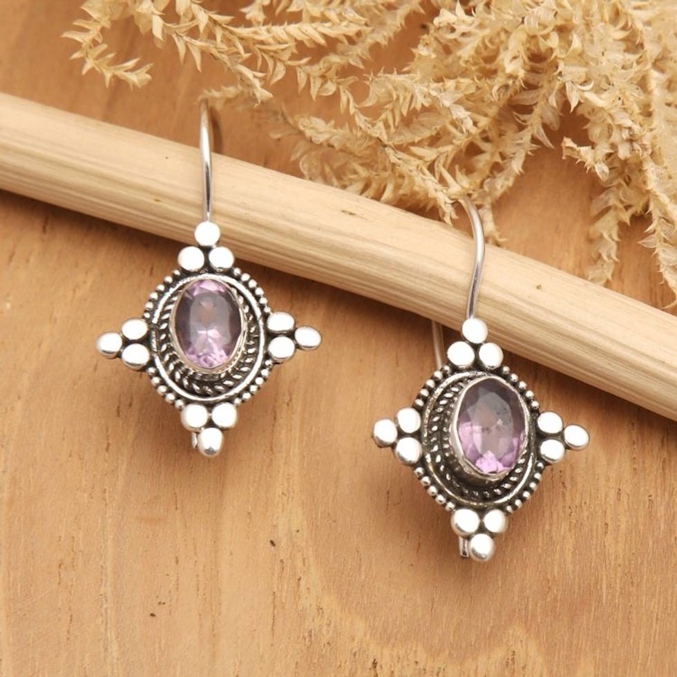 Star-Themed Oval Amethyst Drop Earrings from Bali 'Heavenly Wisdom' Item ID: 2671763108