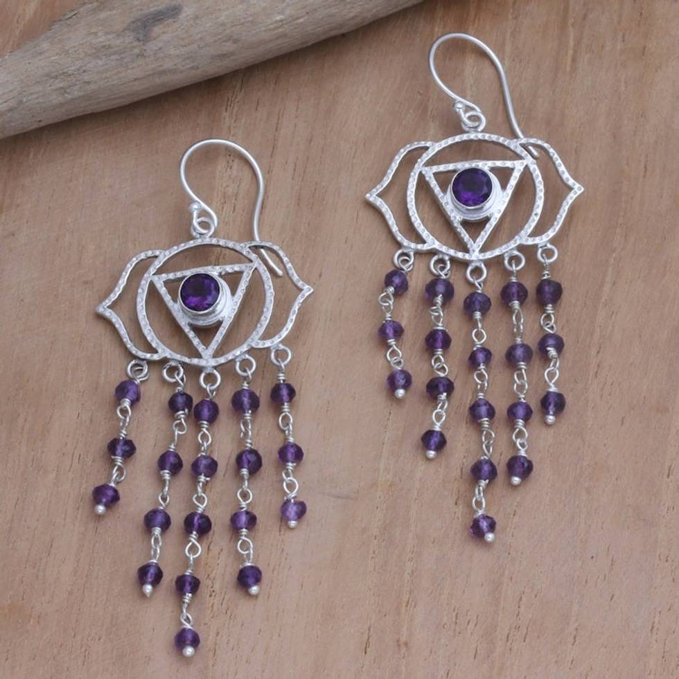 "Designed by Wayan Trisna, these lovely dangle earrings are inspired by the third eye chakra, which signifies the unconscious mind. The Balinese artisan uses sterling silver to hand craft the openwork earrings, accenting the precious metal with purple amethyst stones."
