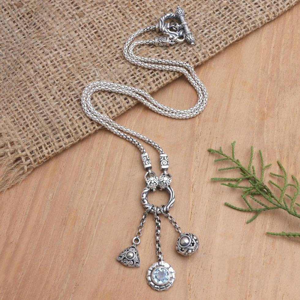 This pendant is so perfect. The topaz is so blue and the craftsmanship is so well done. Not too heavy but has a big presence.