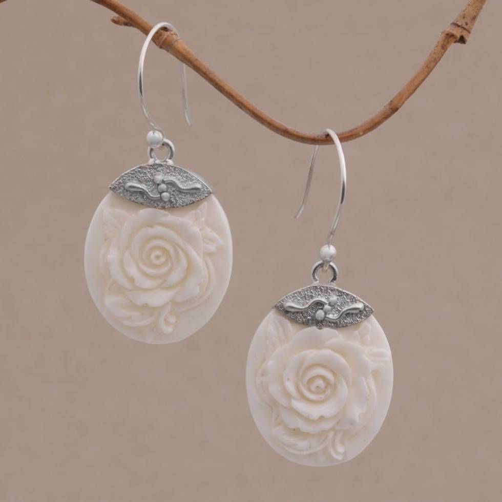 Sterling Silver and Bone Floral Dangle Earrings from Bali 'Twin Roses' Item ID: 2671733295
