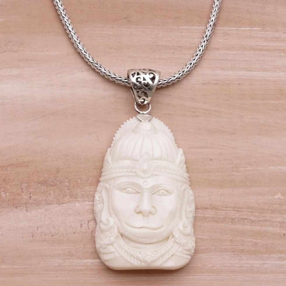 Sterling Silver and Bone Hindu Pendant Necklace from Bali 'Supreme Hanuman' Item ID: 2671733930