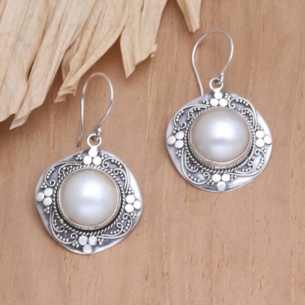 Sterling Silver and Cultured Pearl Dangle Earrings from Bali 'Around Heaven' Item ID: 2671748539