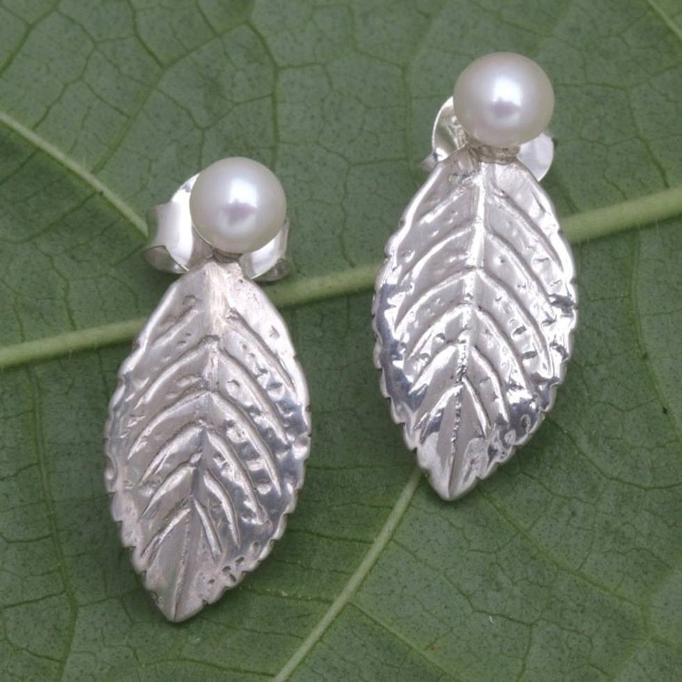 Sterling Silver and Cultured Pearl Drop Earrings from Bali 'Leaf in Clarity' Item ID: 2671748853