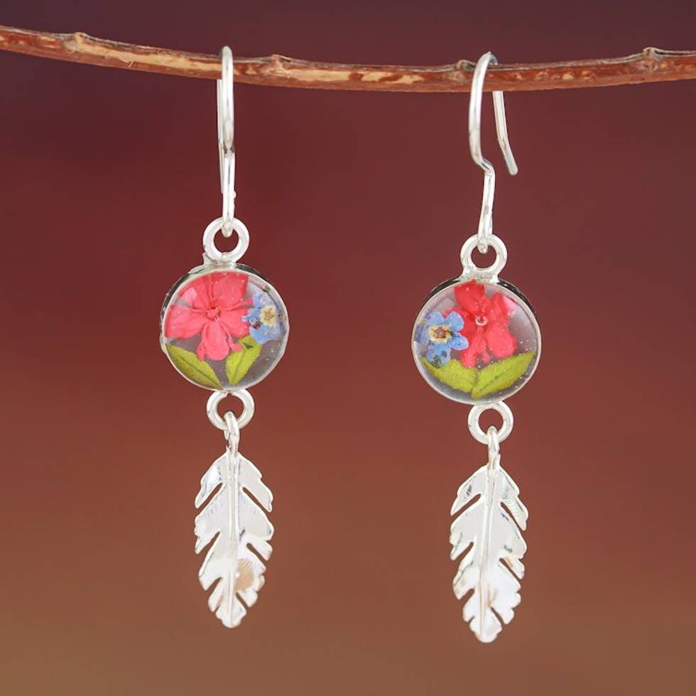 Sterling Silver and Dried Flower Dangle Earrings from Mexico 'Anahuac Red' Item ID: 2669931877