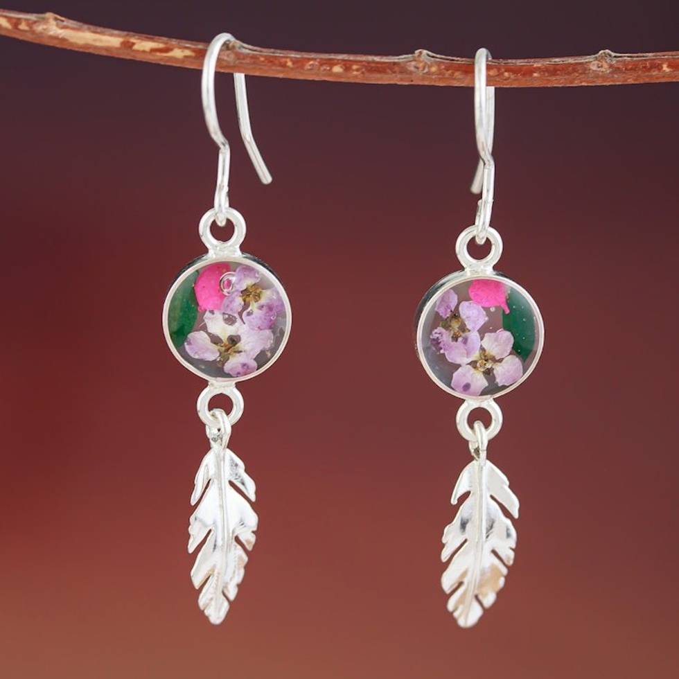 Sterling Silver and Dried Flower Dangle Earrings from Mexico 'Anahuac Purple' Item ID: 2671639174