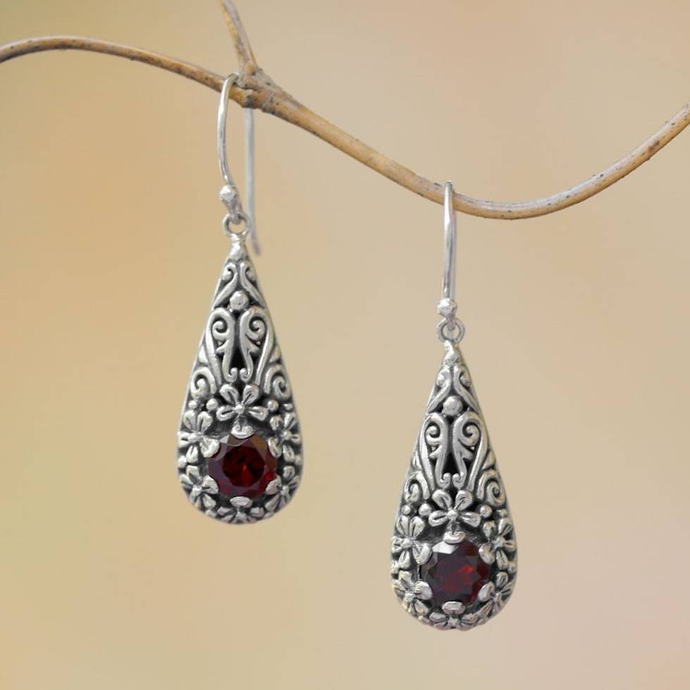 Sterling Silver and Garnet Balinese Plumeria Dangle Earrings 'Hopeful Swirls' Item ID: 2671736595
