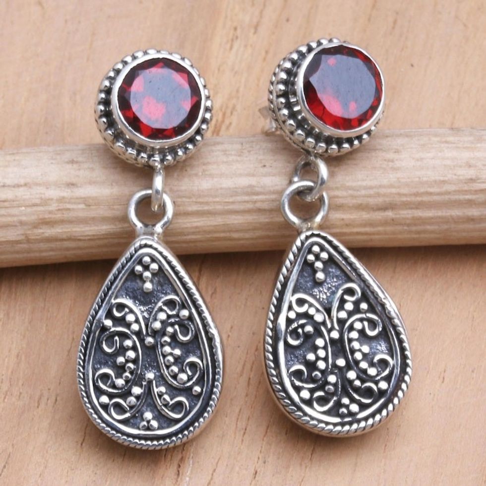 Sterling Silver and Garnet Dangle Earrings from Bali 'Mystic Leaves in Red' Item ID: 2669887216