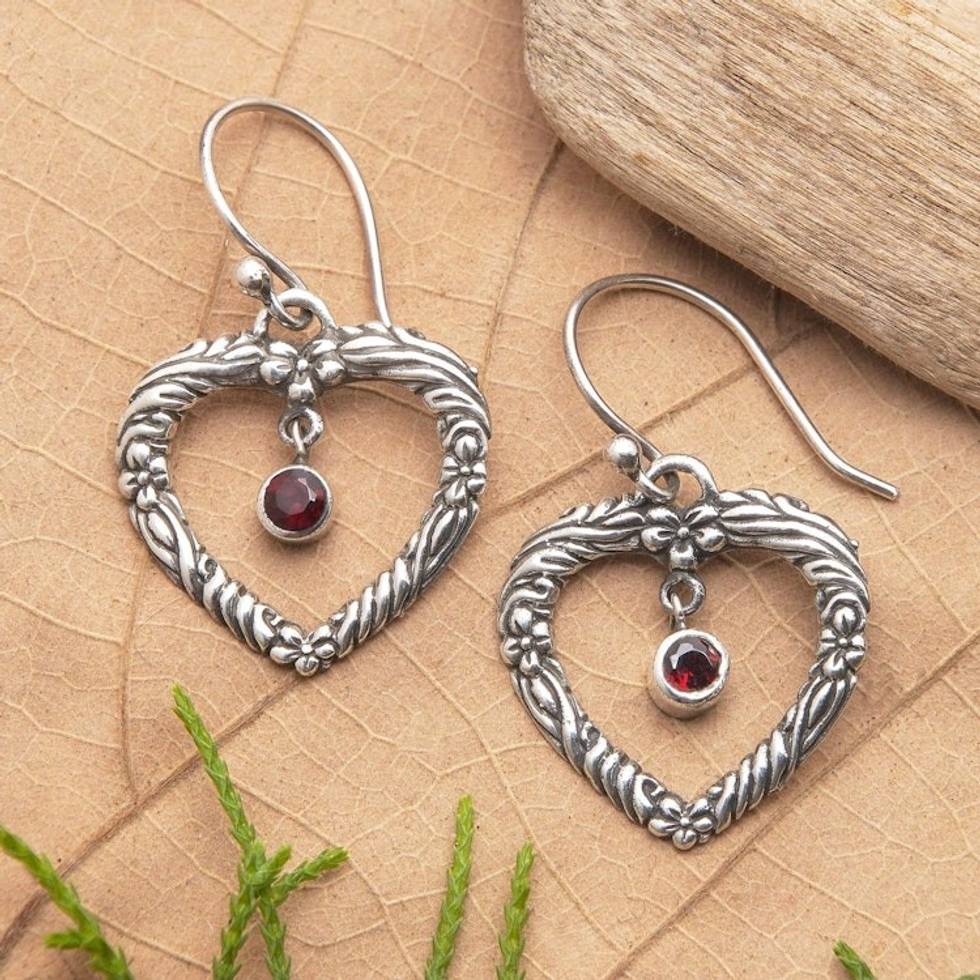 Sterling Silver and Garnet Dangle Earrings from Indonesia 'Steal My Heart' Item ID: 2671702213