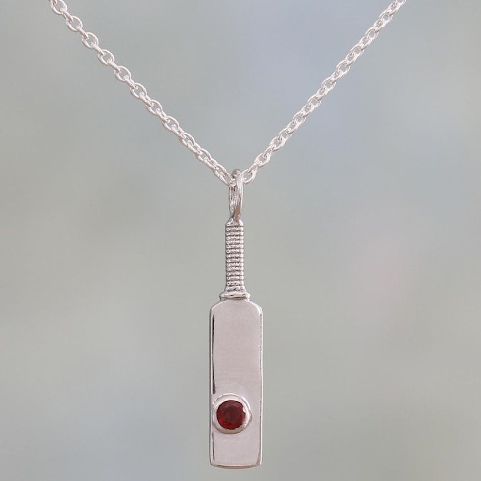 Sterling Silver and Garnet Pendant Necklace from India 'Cricket Bat' Item ID: 2671793725