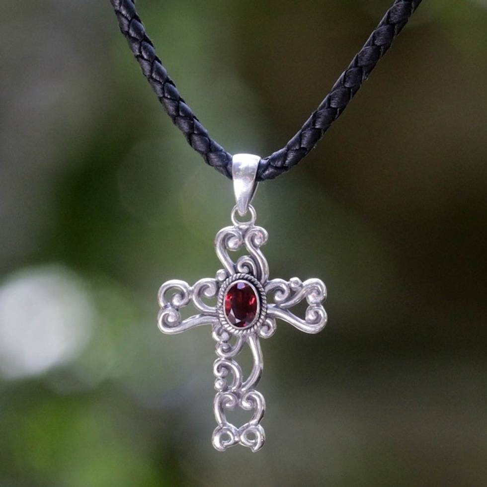 Sterling Silver and Garnet Religious Necklace 'Balinese Cross' Item ID: 2669920653