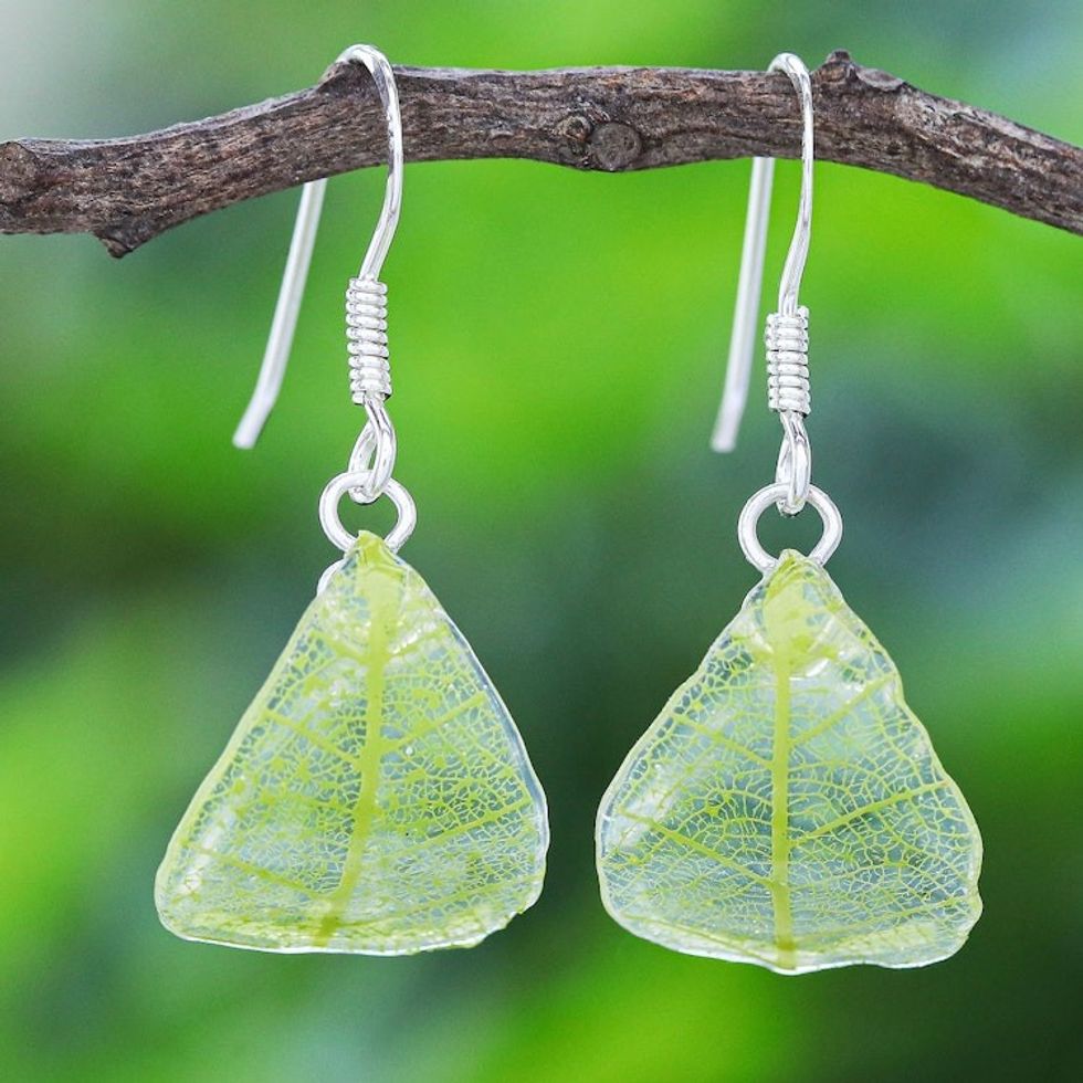 Sterling Silver and Green Rubber Tree Leaf Earrings 'Earthly Delight in Green' Item ID: 2671799732