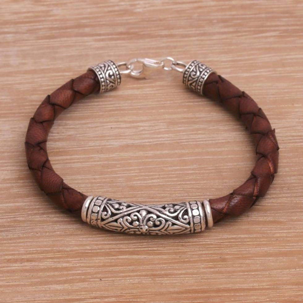 Sterling Silver and Leather Cord Bracelet from Bali 'Earthen Lost Kingdom' Item ID: 2671820966