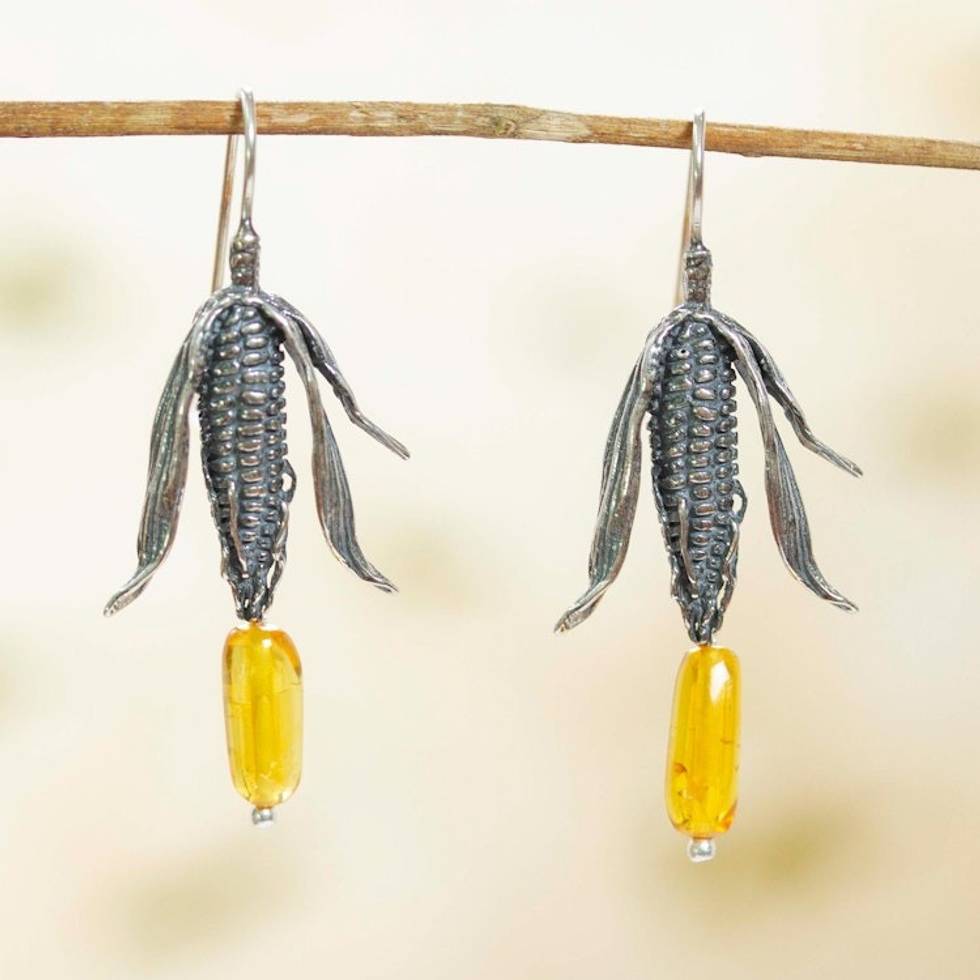 Sterling Silver and Natural Amber Mexican Earrings 'Land of Maize' Item ID: 2669932183