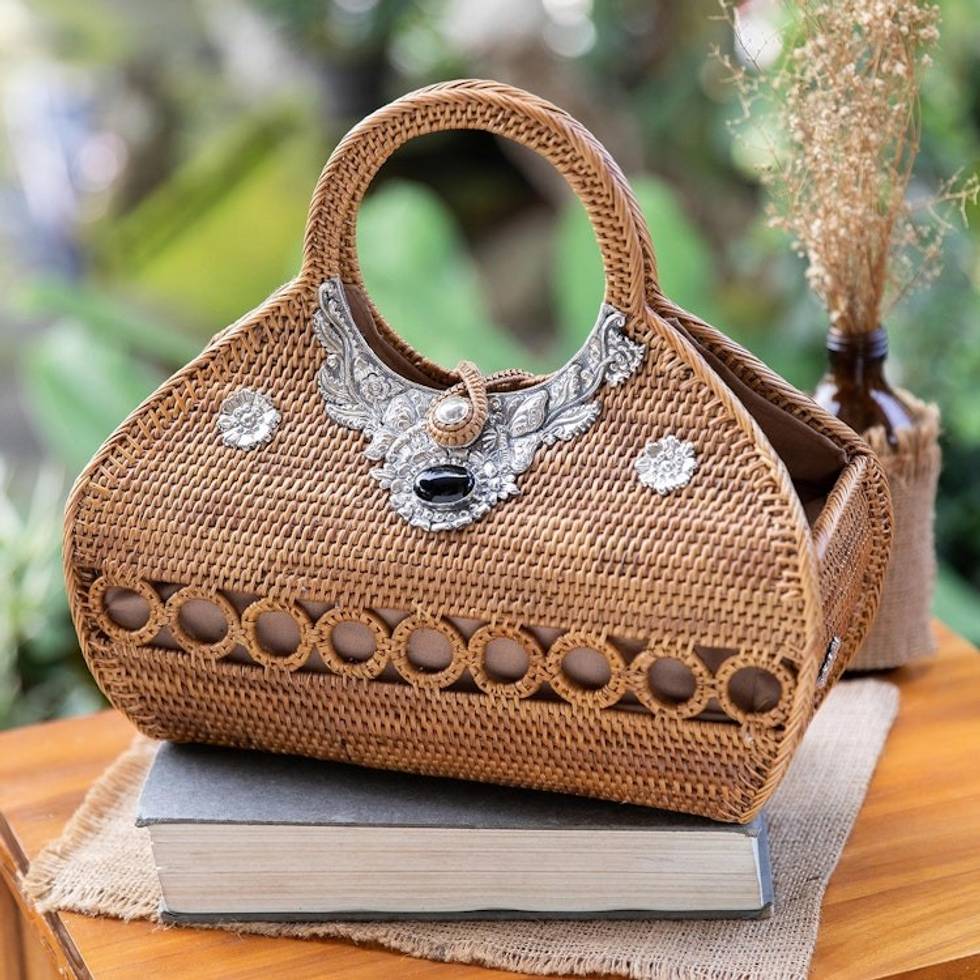 "Bali's Govinda collaborates with regional artisans to create this exquisite handle bag. Using ate grass and rattan, the team handcrafts every detail of this sophisticated design, adding sterling silver accents with embossed motifs that allow for a magical illusion. As the main element, an onyx stone adds a mystic touch to the item, symbolizing protection. "