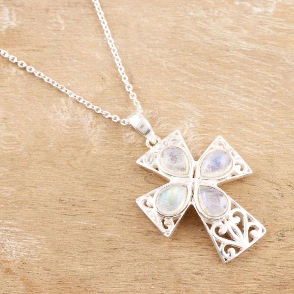 Sterling Silver and Rainbow Moonstone Cross Necklace 'True Faith' Item ID: 2671788762