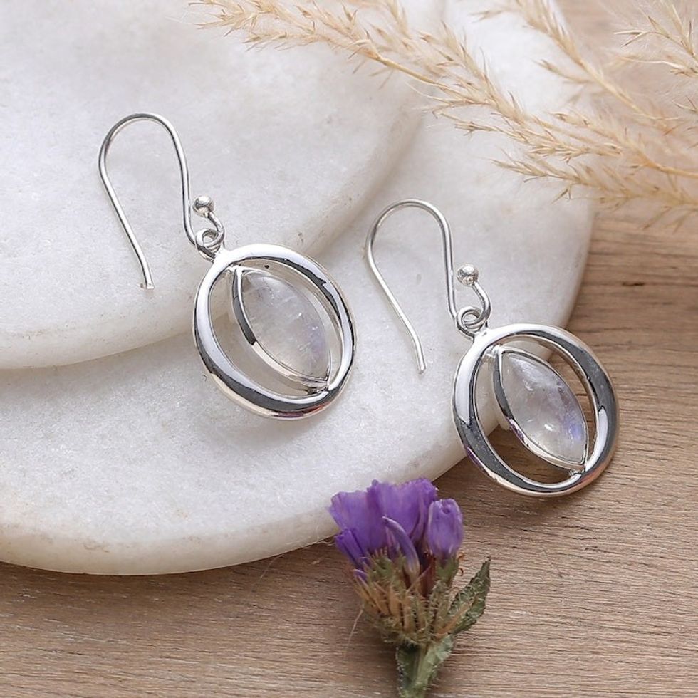 Sterling Silver and Rainbow Moonstone Orb Dangle Earrings 'Captured Mist' Item ID: 2671781651